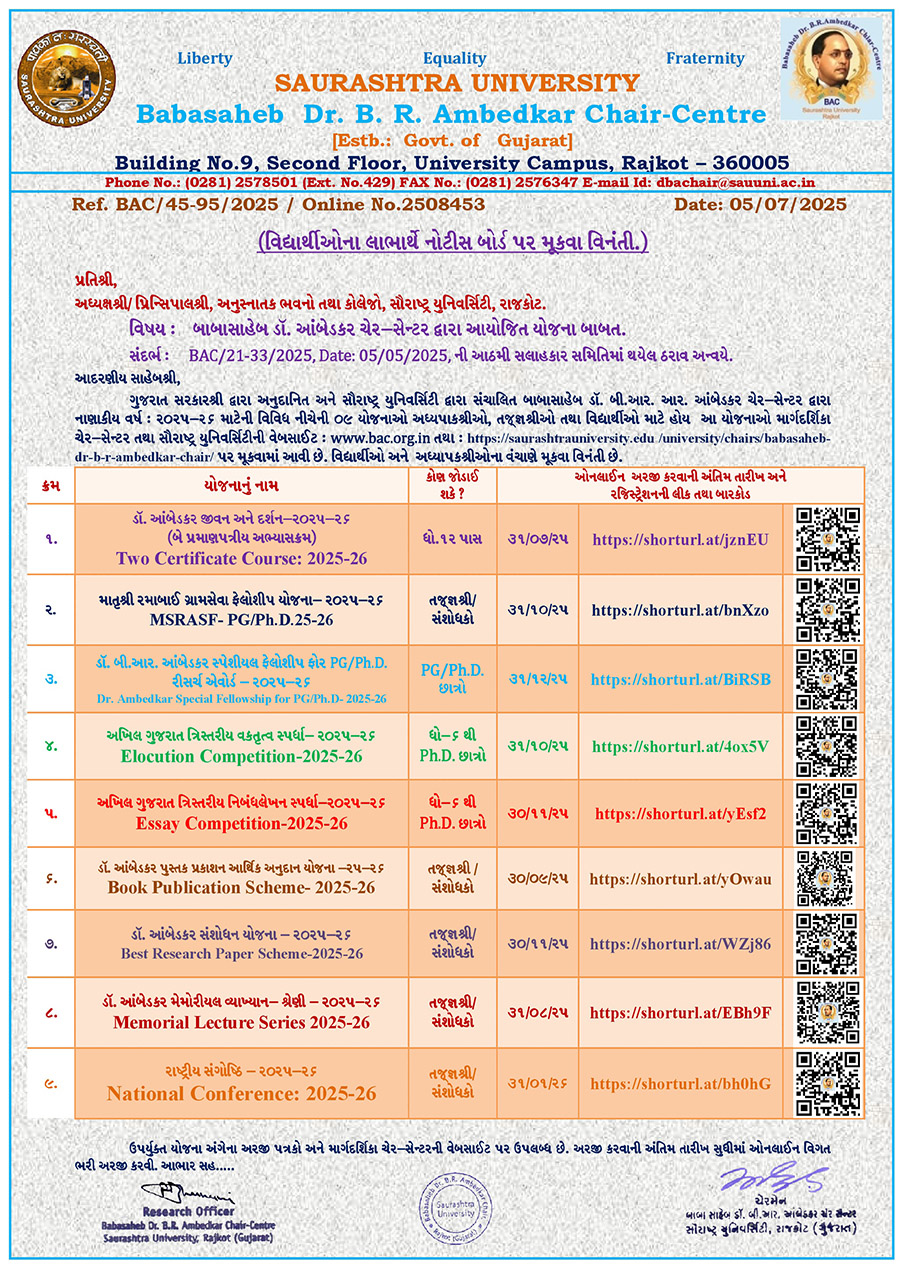Bharat Ratna Babasaheb Dr. Bhimrao Ramji Ambedkar birth centenary celebration Committee, Government of Gujarat decided in 1992 to give one time grant of Rs. 5 lacks to establish Babasaheb Dr. Bhimrao Ramji Ambedkar Chair in all the Universities of the state. Saurashtra University, Rajkot was also given a Chair, ( Commissioner of Yuvak Seva and Cultural Activities , Government of Gujarat, Sachivalay, Gandhinagar, office order no YPS-SNA-2003-G-4, Date 31-3-2003 ) Which had to function out of the interest earned form this one time grant of Rs. 5 lacks. Saurashtra University invited and nominated Dr. Hemixa Rao, Professor & Head, Department of Sociology as a Chairperson of Dr. B. R. Ambedkar Chair. Department of Social Justice and Empowerment, Government of Gujarat, Sachivalay, Gandhinagar, Circular No. ABD/102016/63705/H(IWDMS/71550) Date 29-04-2016 to Sanction a grant of Rs. 35 Lacks to establish Babasaheb Dr. Bhimrao Ramji Ambedkar Chair - Centre for Dr. B. R. Ambedkar Studies. Honourable Vice Chancellor Nominated Dr. Raja N. Kathad, Professor, Department of Sanskrit, Saurashtra University as a Chairman of Dr. B. R. Ambedkar Chair - Centre on Date 06-12-2016. And release grant of Rs. 35 Lacks for Babasaheb Dr. B.R. Ambedkar Chair - Centre for Dr. B. R. Ambedkar Studies by Department of Schedule caste welfare, 4/2, Dr. Jivarajmehta bhavan, Government of Gujarat, Gandhinagar, circular no. AJK- G-1/1/2016-17/19 TO 31, Date 05-01-2017